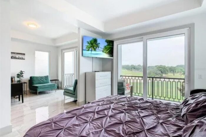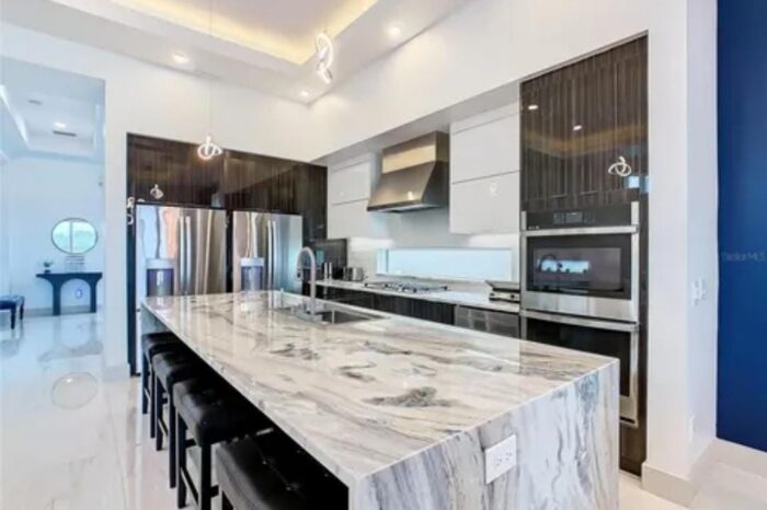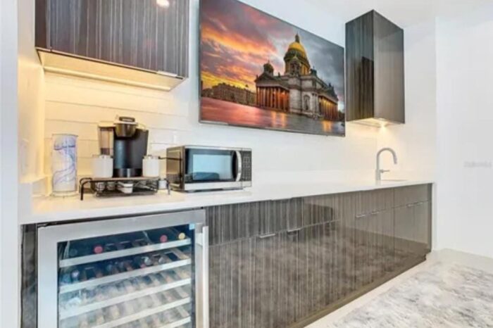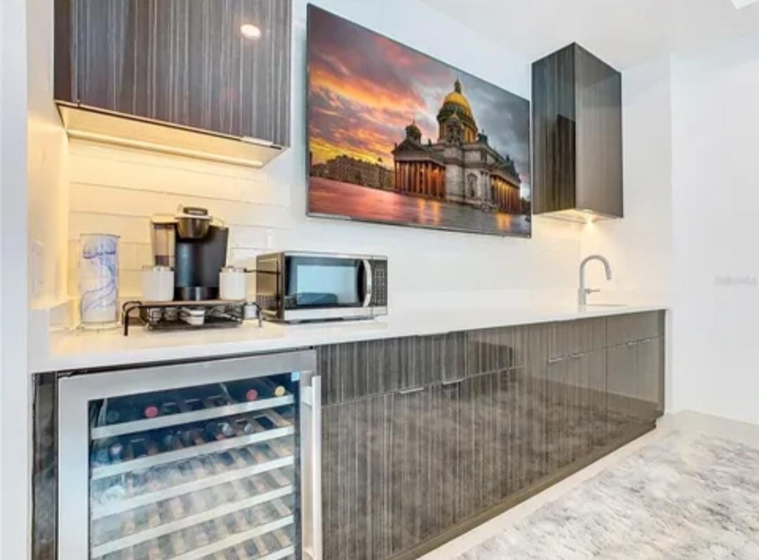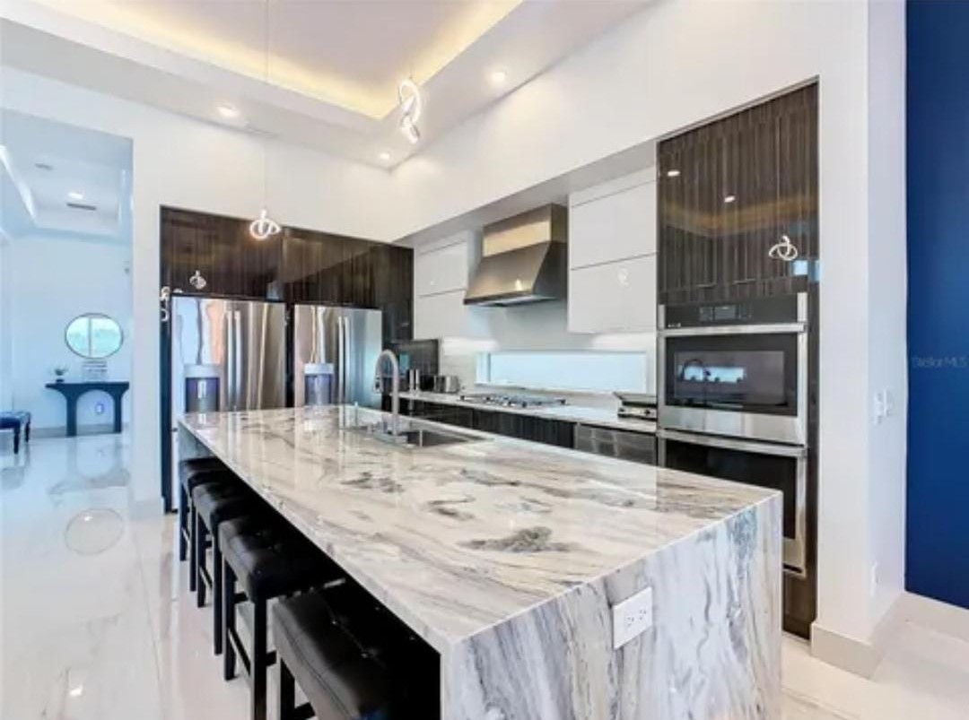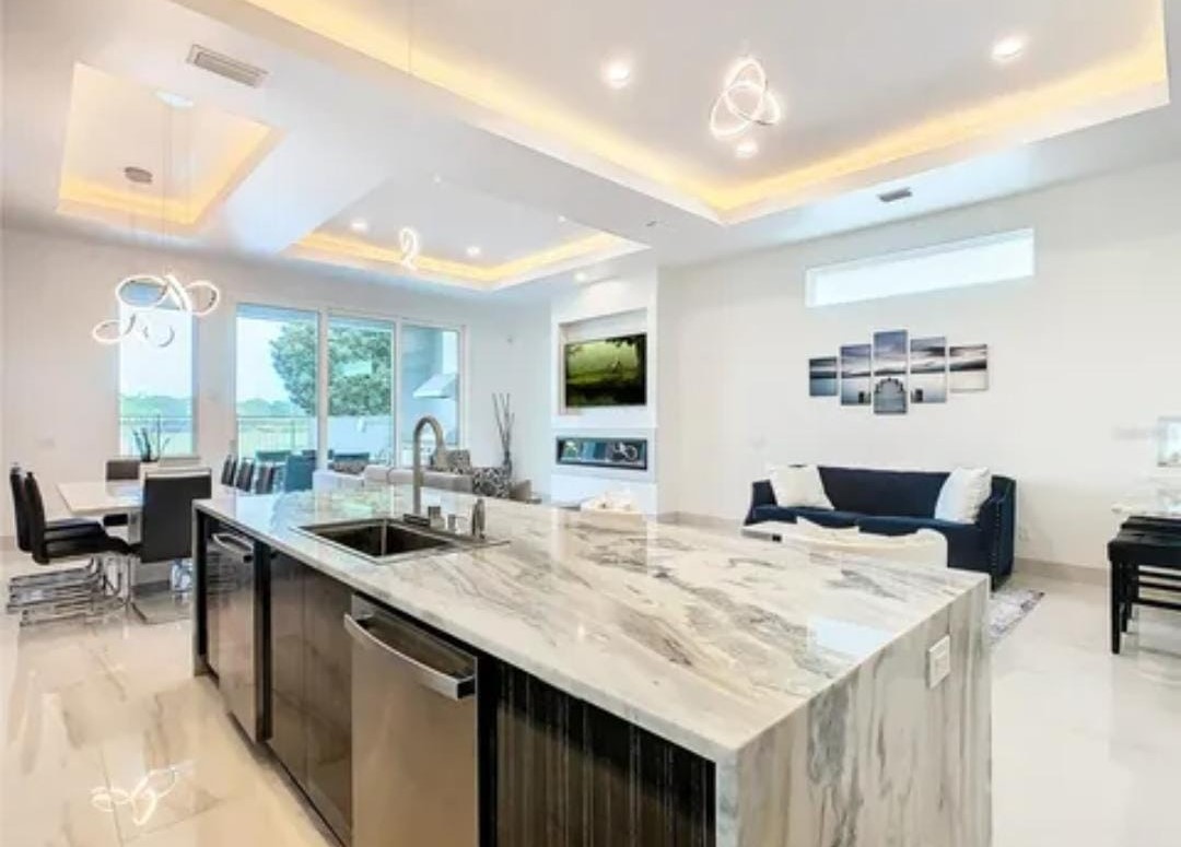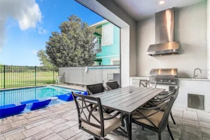 Gather outside in a fully equipped Florida-style kitchen with grill, fridge, sink, TV, and fireplace. Whether dining al fresco or relaxing poolside, the space is built for comfort and connection.